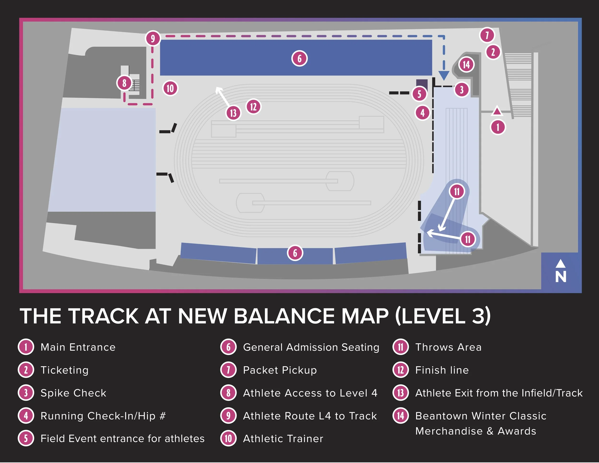 The TRACK at new balance will open its doors on Saturday from 7:30AM until about 7:00PM and on Sunday from 7:30AM until about 7:00PM. Exact times will be updated closer to the meet. Packet Pickup will be available during these hours.